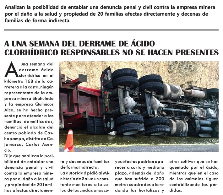 A una semana del derrame de ácido clorhídrico, responsables no se hacen presentesBy Monitoreo Medios / mayo 20, 2025 FUENTE: El Clarín – Pág. 3
