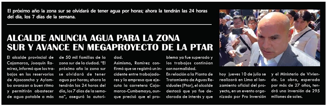 Alcalde anuncia agua para la zona sur y avance en megaproyecto de la PTARBy Monitoreo Medios / julio 10, 2025 Fuente: El Clarín - Pág. 4Fecha: 10 julio, 2025