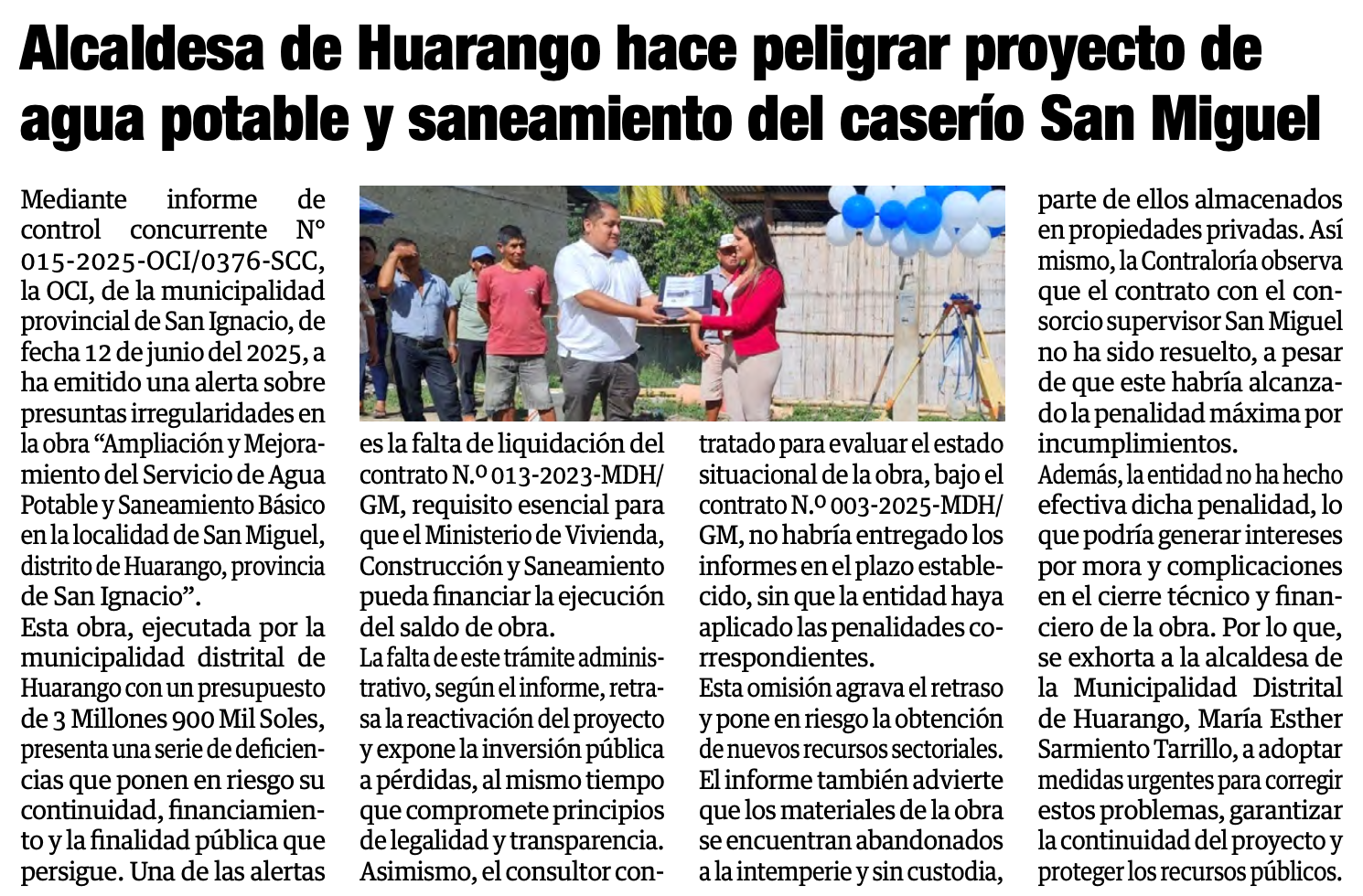Alcaldesa de Huarango hace peligrar proyecto de agua potable y saneamiento del caserío San MiguelBy Monitoreo Medios / junio 19, 2025 Fuente: Panorama Cajamarquino - Pág. 17Fecha: 19 junio, 2025