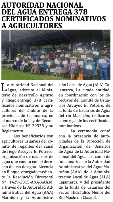 Autoridad Nacional del Agua entrega 378 certificados nominativos a agricultoresBy Monitoreo Medios / junio 11, 2025 Fuente: Alma Noticias - Pág. 4Fecha: 11 junio, 2025