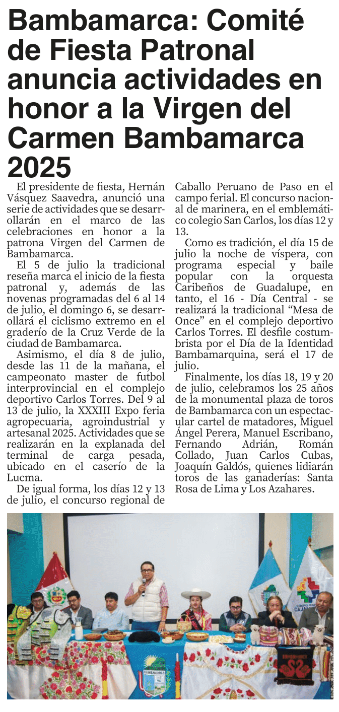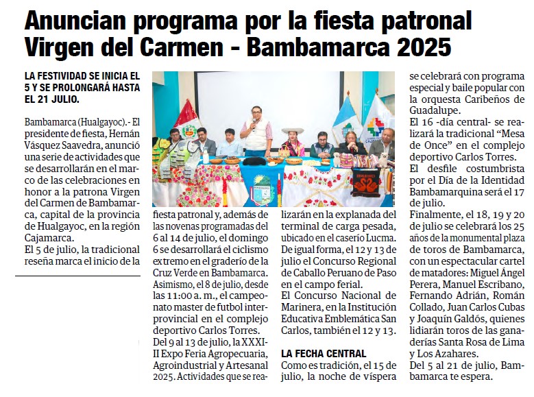 Bambamarca: Comité de Fiesta Patronal anuncia actividades en honor a la Virgen del Carmen Bambamarca 2025By Monitoreo Medios / junio 26, 2025 Fuente: El Nuevo Diario - Pág. 5 / Panorama Cajamarquino - Pág. 20Fecha: 26 junio, 2025