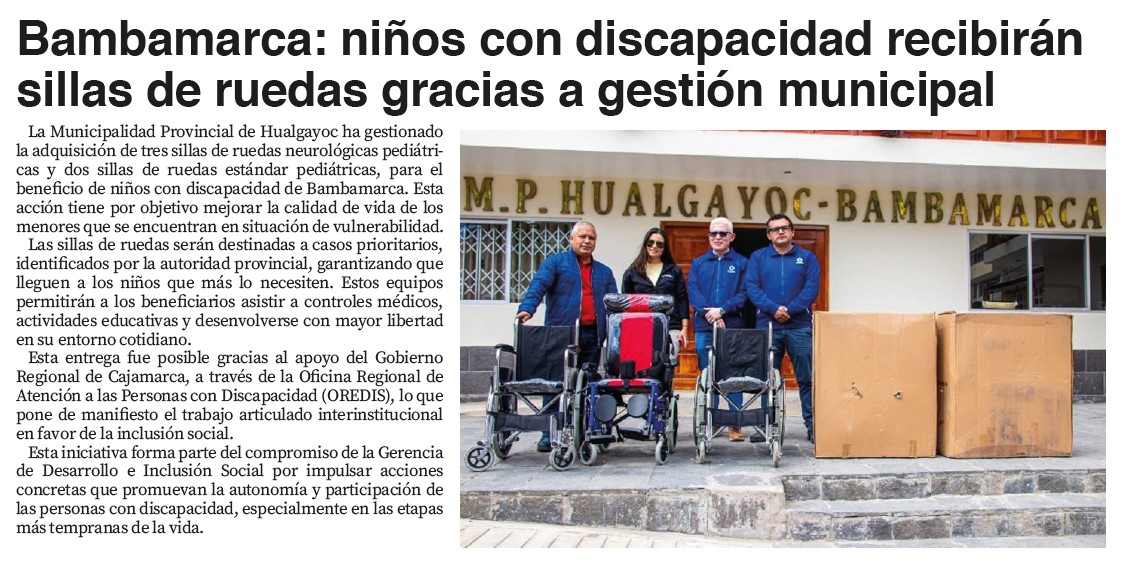Bambamarca: niños con discapacidad recibirán sillas de ruedas gracias a gestión municipalBy Monitoreo Medios / septiembre 5, 2025