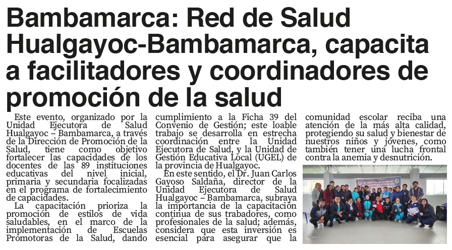 Bambamarca: Red de Salud Hualgayoc – Bambamarca, capacita a facilitadores y coordinadores de promoción de la saludBy Monitoreo Medios / abril 1, 2025 FUENTE: El Nuevo Diario – Pág. 5