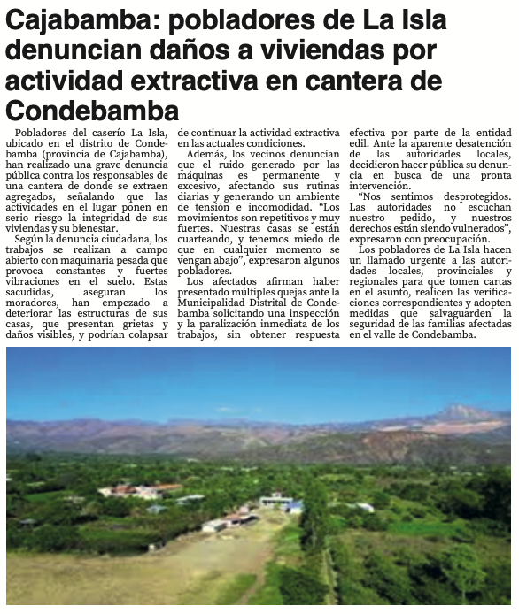 Cajabamba: pobladores de La Isla denuncian daños a viviendas por actividad extractiva en cantera de CondebambaBy Monitoreo Medios / mayo 26, 2025 FUENTE: El Nuevo Diario – Pág. 5