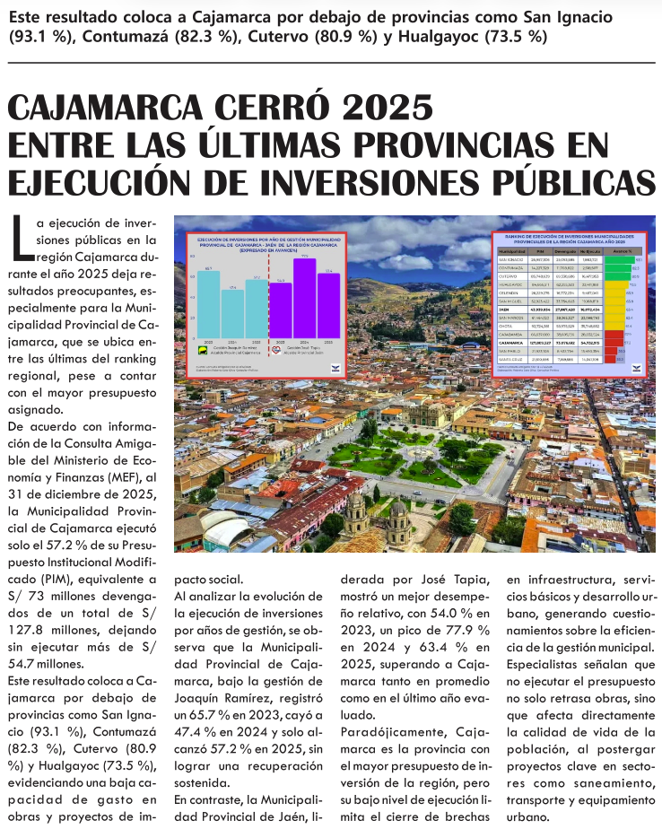Cajamarca cerró 2025 entre las últimas provincias en ejecución de inversiones públicasBy Monitoreo Medios / enero 6, 2026 Fuente: El Clarín - Pág. 3Fecha: 6 enero, 2026