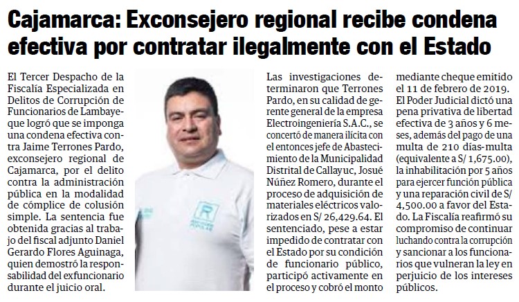 Cajamarca: Exconsejero regional recibe condena efectiva por contratar ilegalmente con el EstadoBy Monitoreo Medios / octubre 20, 2025 Fuente: Panorama Cajamarquino - Pág. 6Fecha: 20 octubre, 2025