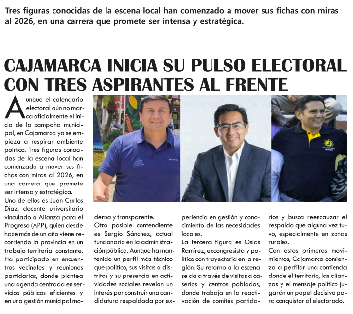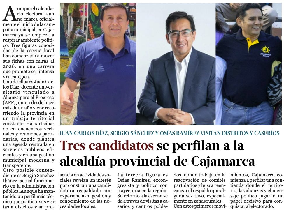 Cajamarca inicia su pulso electoral con tres aspirantes al frenteBy Monitoreo Medios / mayo 23, 2025 FUENTE: El Clarín – Pág. 3 / El Mercurio – Pág. 8