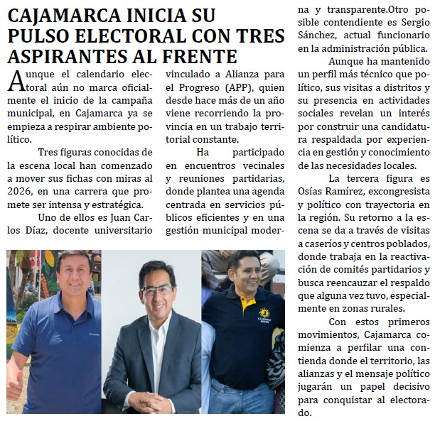 Cajamarca inicia su pulso electoral con tres aspirantes al frenteBy Monitoreo Medios / mayo 22, 2025 FUENTE: Alma Noticias – Pág. 5