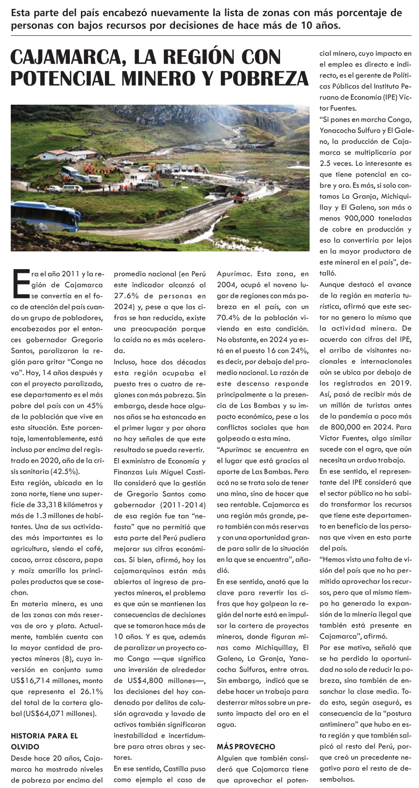 Cajamarca, la región con potencial minero y pobrezaBy Monitoreo Medios / mayo 27, 2025 FUENTE: El Clarín – Pág. 8