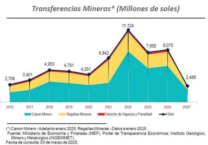 En enero de 2025, las transferencias económicas generadas por la actividad minera que comprenden el Canon Minero y las Regalías Mineras (Legales y Contractuales), superaron los S/ 2486 millones, reflejando la importancia de la actividad minera como motor económico para el país.