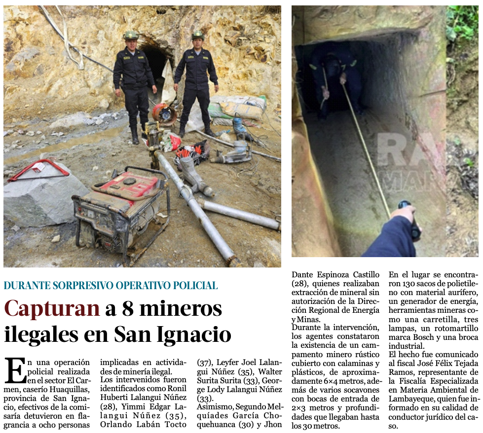 Capturan a 8 mineros ilegales en San IgnacioBy Monitoreo Medios / mayo 23, 2025 FUENTE: El Mercurio – Pág. 5
