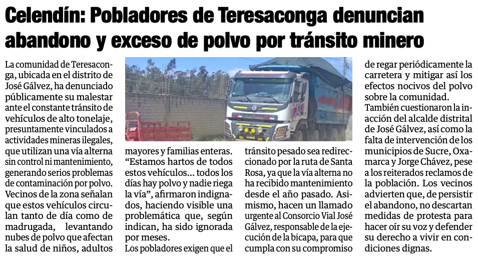 Celendín: Pobladores de Teresaconga denuncian abandono y exceso de polvo por tránsito minero