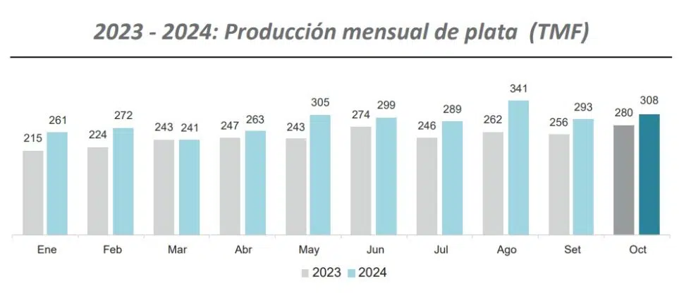 La producción nacional de plata, en octubre del 2024, reportó 307 847 kilogramos finos evidenciando un incremento de 4.9% respecto a lo obtenido el mes previo (293 411 kilogramos finos). Asimismo, se reflejó un crecimiento de 10.0% en comparación con similar mes del año anterior (279 888 kilogramos finos).