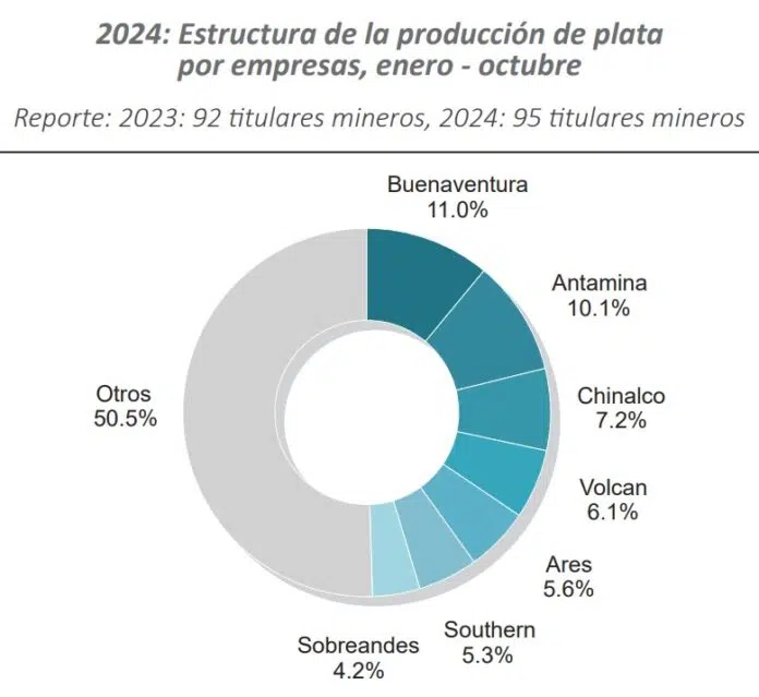 A nivel de titulares mineros, Compañía de Minas Buenaventura S.A.A. continuó como líder de la producción nacional de plata representando el 11.0%. Muy de cerca le siguió Compañía Minera Antamina S.A., en segundo lugar, con el 10.1% de la participación total; mientras que, en tercer lugar, se posicionó Minera Chinalco Perú S.A. con el 7.2%.