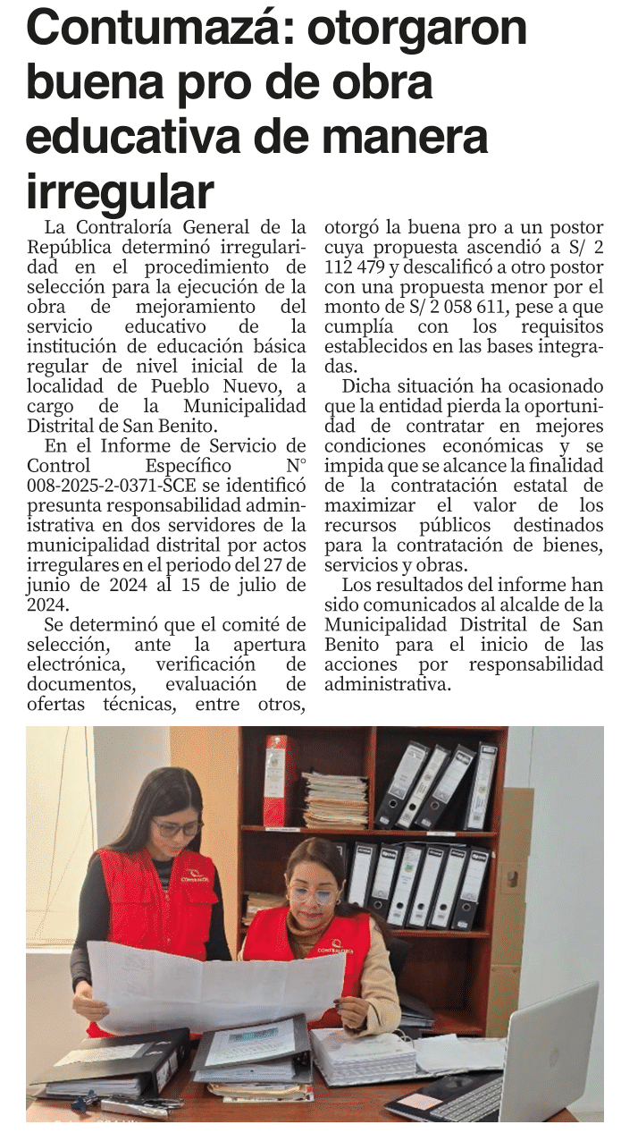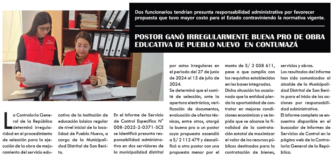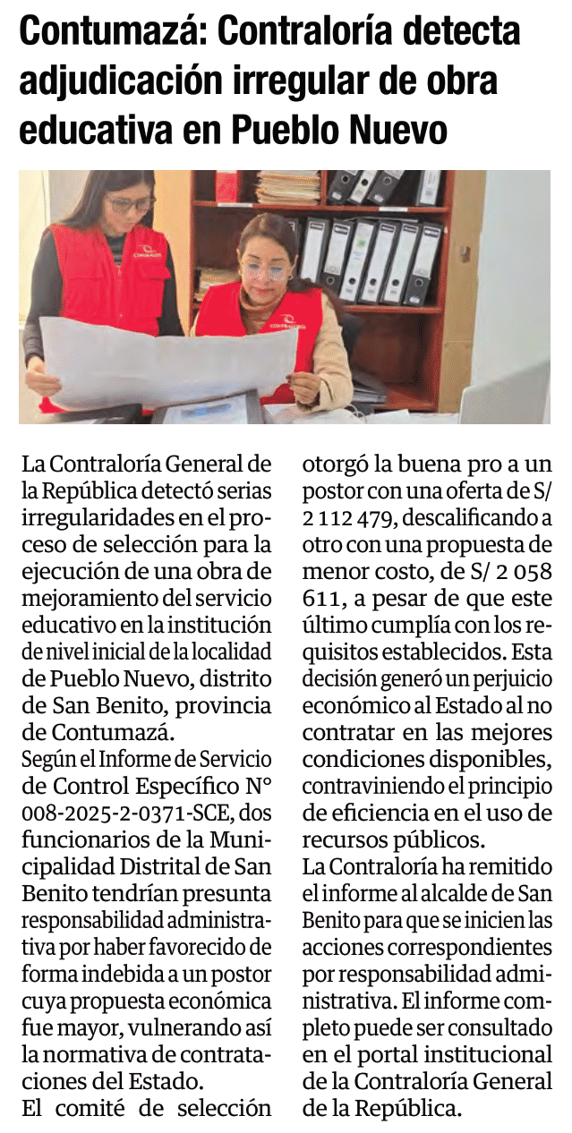 Contumazá: Contraloría detecta adjudicación irregular de obra educativa en Pueblo NuevoBy Monitoreo Medios / mayo 27, 2025 FUENTE: Panorama Cajamarquino – Pág. 4 / El Clarín – Pág. 5 / El Nuevo Diario – Pág. 5
