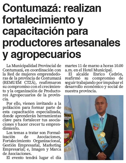 Contumazá: realizan fortalecimiento y capacitación para productores artesanales y agropecuariosBy Monitoreo Medios / marzo 10, 2025 FUENTE: El Nuevo Diario – Pág. 5