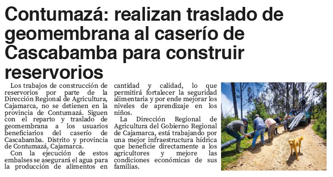 Contumazá: realizan traslado de geomembrana al caserío de Cascabamba para construir reservoriosBy Monitoreo Medios / abril 23, 2025 FUENTE: El Nuevo Diario – Pág. 5