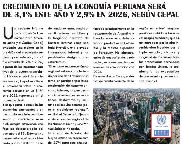 Crecimiento de la economía peruana será de 3,1% este año y 2,9% en 2026, según CEPALBy Monitoreo Medios / agosto 7, 2025 Fuente: El Clarín - Pág. 8Fecha: 7 agosto, 2025
