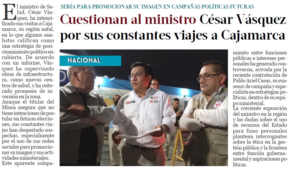 Cuestionan al ministro César Vásquez por sus constantes viajes a CajamarcaBy Monitoreo Medios / marzo 5, 2025 FUENTE: El Mercurio – Pág. 8