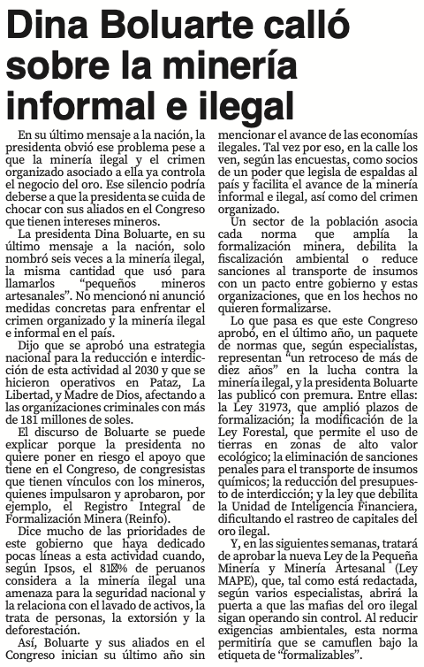 Dina Boluarte calló sobre la minería informal e ilegalBy Monitoreo Medios / julio 30, 2025 Fuente: El Nuevo Diario - Pág. 6Fecha: 30 julio, 2025