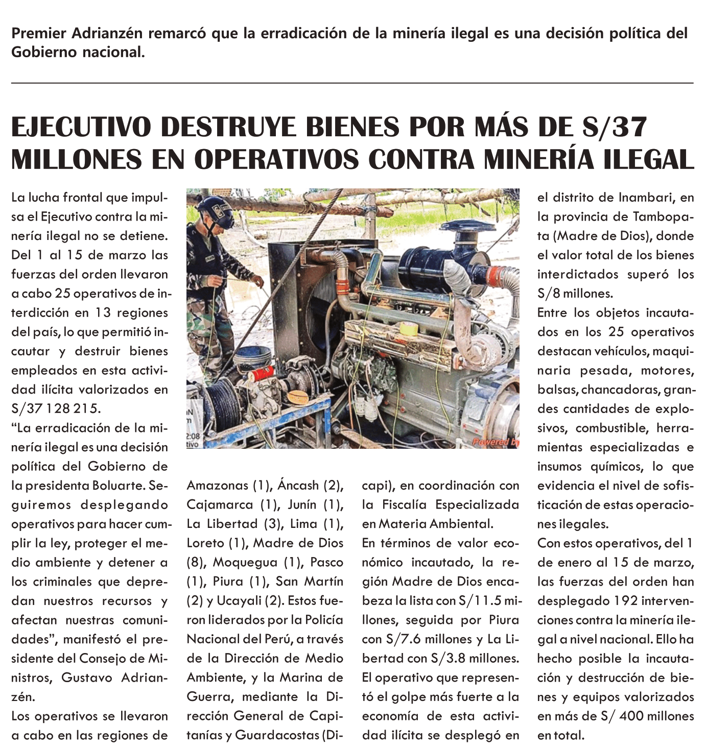 Ejecutivo destruye bienes por más de S/37 millones en operativos contra minería ilegalBy Monitoreo Medios / marzo 28, 2025 FUENTE: El Clarín – Pág. 6