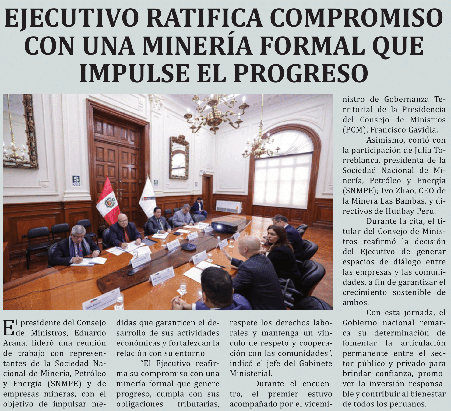 Ejecutivo ratifica compromiso con una minería formal que impulse el progresoBy Monitoreo Medios / julio 11, 2025 Fuente: Alma Noticias - Pág. 8Fecha: 11 julio, 2025