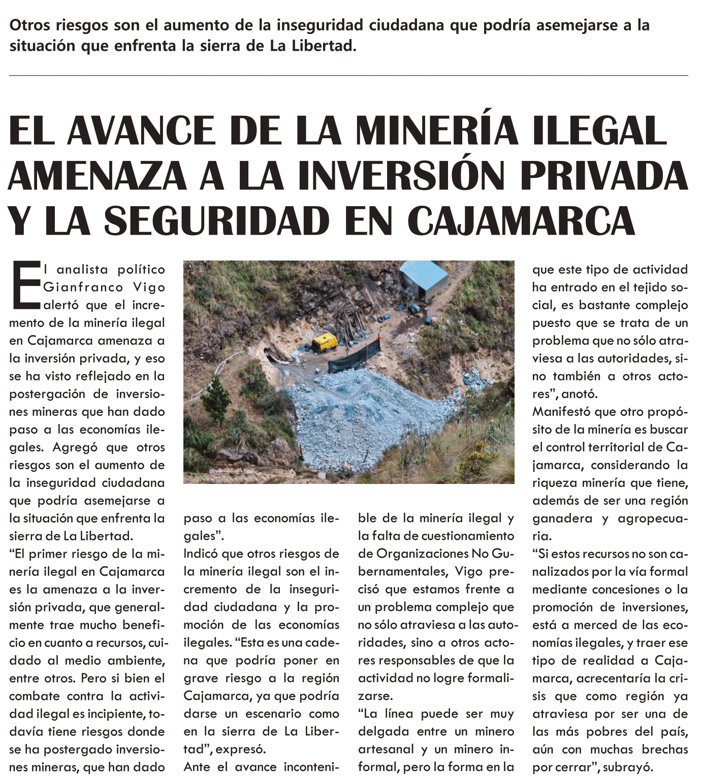 El avance de minería ilegal amenaza a la inversión privada y la seguridad en CajamarcaBy Monitoreo Medios / abril 1, 2025 FUENTE: El Clarín – Pág. 3