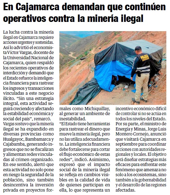 En Cajamarca demandan que continúen operativos contra la minería ilegalBy Monitoreo Medios / agosto 27, 2025 Fuente: Panorama Cajamarquino - Pág. 5Fecha: 27 agosto, 2025