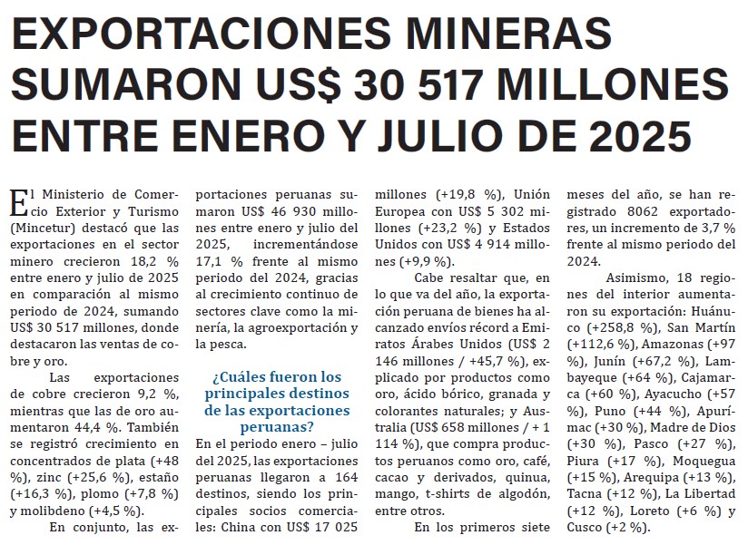Exportaciones mineras sumaron US$ 30 517 millones entre enero y julio de 2025