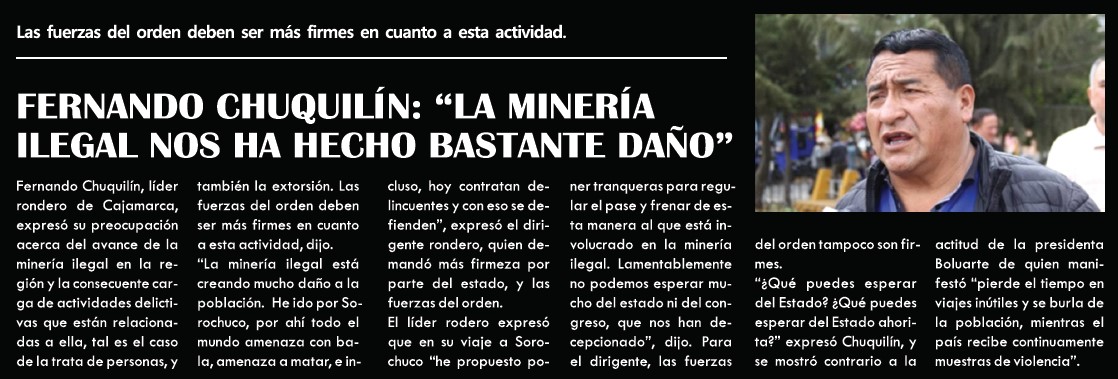 Fernando Chuquilín: «La minería ilegal nos ha hecho bastante daño»By Monitoreo Medios / agosto 27, 2025 Fuente: El Clarín - Pág. 4Fecha: 27 agosto, 2025