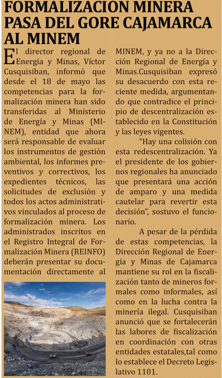 Formalización minera pasa del GORE Cajamarca al MINEMBy Monitoreo Medios / junio 9, 2025 Fuente: Alma Noticias - Pág. 4Fecha: 9 junio, 2025