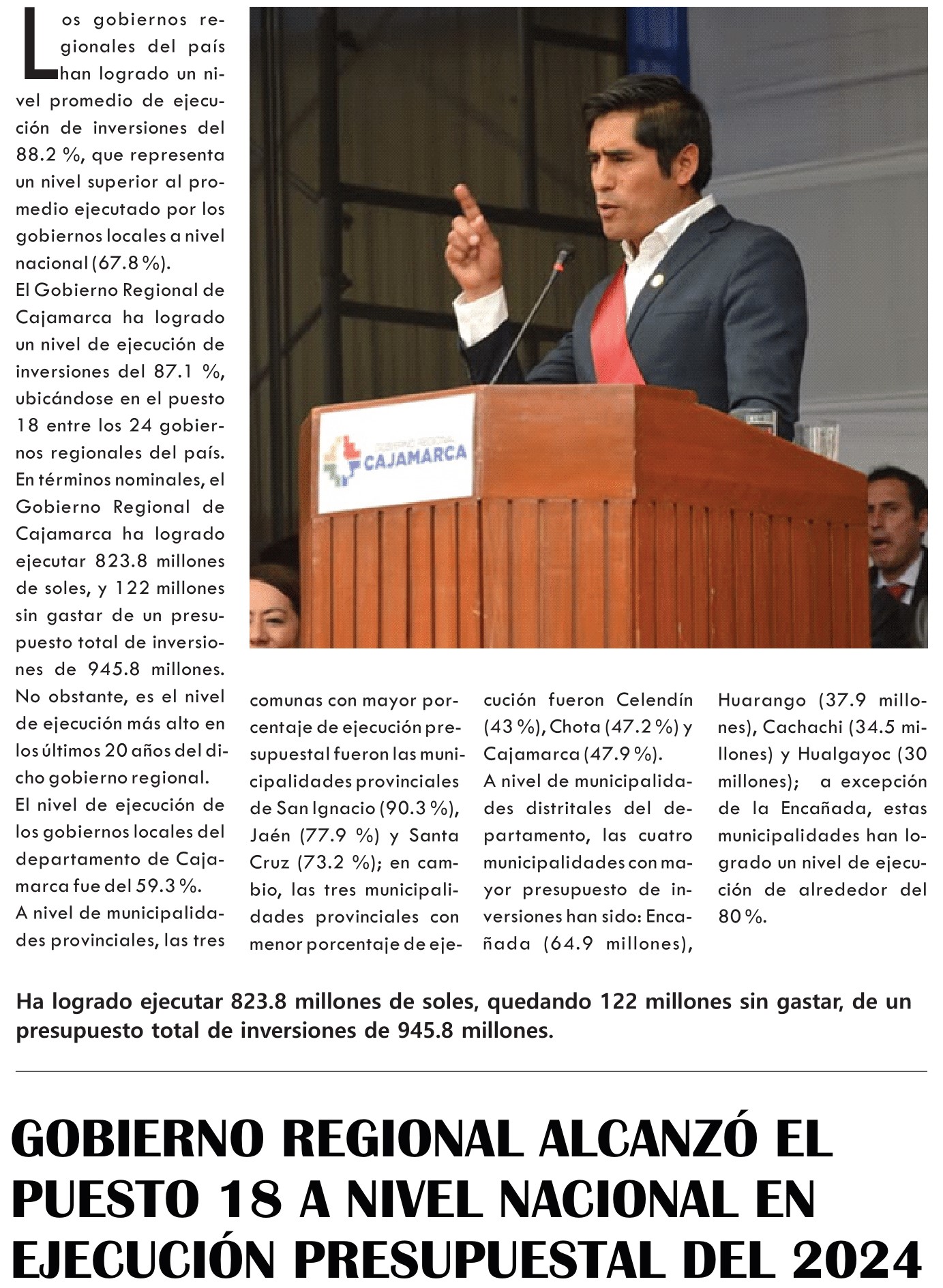 Gobierno Regional alcanzó el puesto 18 a nivel nacional en ejecución presupuestal del 2024By Monitoreo Medios / enero 3, 2025 FUENTE: El Clarín – Pág. 4