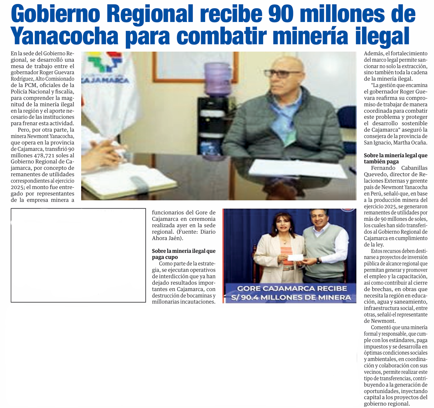 Gobierno Regional recibe 80 millones de Yanacocha para combatir minería ilegal