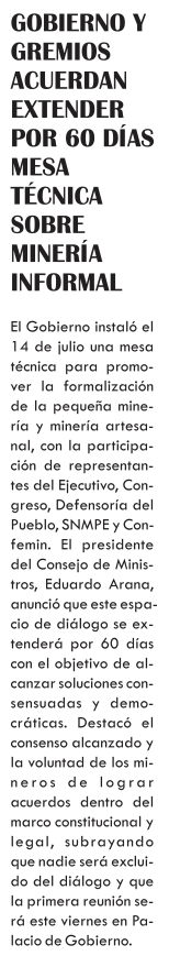 Gobierno y gremios acuerdan extender por 60 días mesa técnica sobre minería informalBy Monitoreo Medios / julio 15, 2025 Fuente: El Clarín - Pág. 7Fecha: 15 julio, 2025