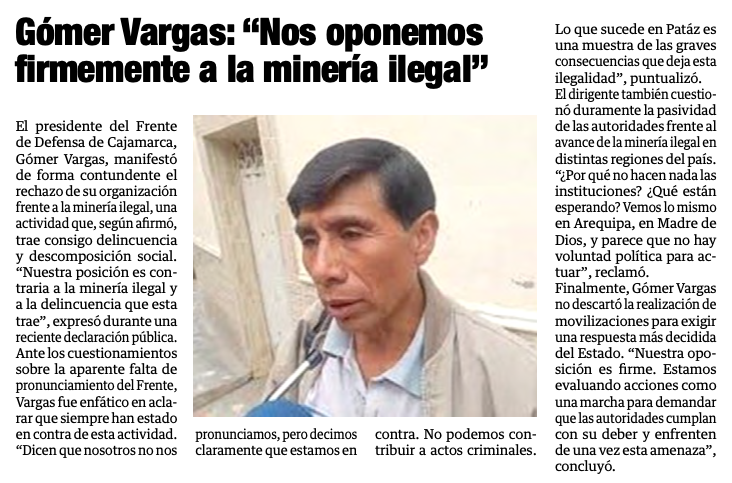 Gómer Vargas: «Nos oponemos firmemente a la minería ilegal»By Monitoreo Medios / mayo 23, 2025 FUENTE: Panorama Cajamarquino – Pág. 5