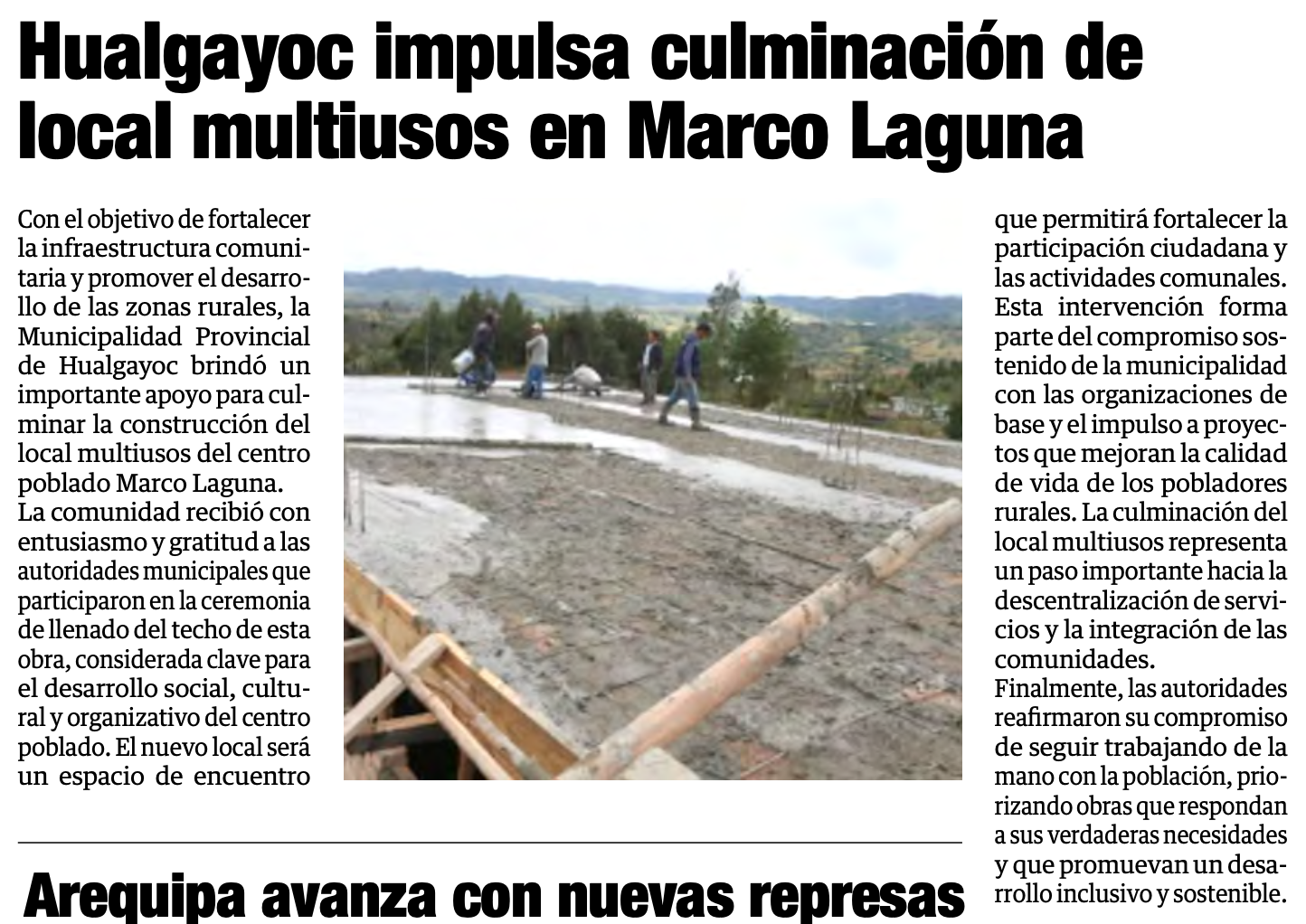 Hualgayoc impulsa culminación de local multiusos en Marco LagunaBy Monitoreo Medios / junio 20, 2025 Fuente: Panorama Cajamarquino - Pág. 3Fecha: 20 junio, 2025