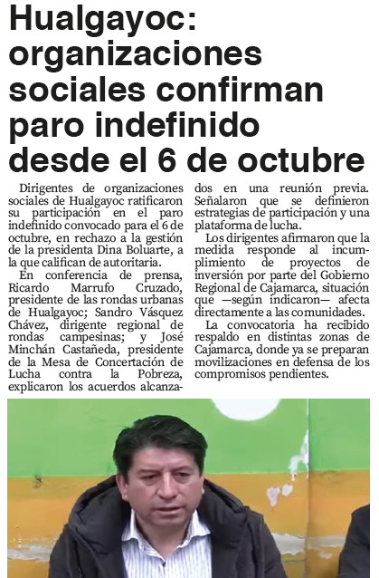 Hualgayoc: organizaciones sociales confirman paro indefinido desde el 6 de octubreBy Monitoreo Medios / octubre 2, 2025