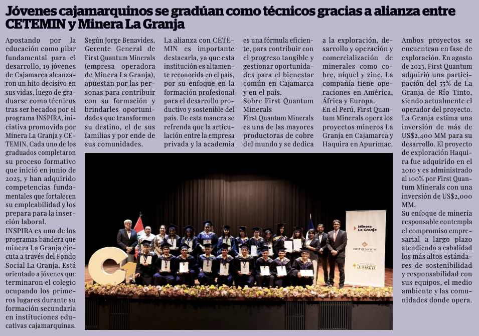 Jóvenes cajamarquinos se gradúan como técnicos gracias a alianza entre CETEMIN y Minera La Granja