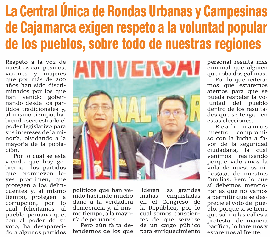 La Central Única de Rondas Urbanas y Campesinas de Cajamarca exigen respeto a la voluntad popular de los pueblos, sobre todo de nuestras regiones