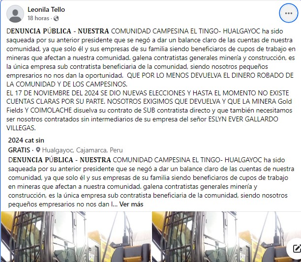 EL 17 DE NOVIEMBRE DEL 2024 SE DIO NUEVAS ELECCIONES Y HASTA EL MOMENTO NO EXISTE CUENTAS CLARAS POR SU PARTE. NOSOTROS EXIGIMOS QUE DEVUELVA Y QUE LA MINERA Gold Fields Y COIMOLACHE disuelva su contrato de SUB contratista directo y que también necesitamos ser nosotros contratados sin intermediarios de su empresa del señor ESLYN EVER GALLARDO VILLEGAS.
