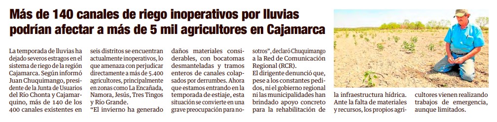 Más de 140 canales de riego inoperativos por lluvias, podrían afectar a más de 5 mil agricultores en Cajamarca