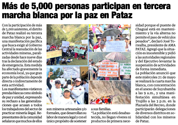Más de 5,000 personas participan en tercera marcha blanca por la paz en PatazBy Monitoreo Medios / mayo 21, 2025 FUENTE: Panorama Cajamarquino – Pág.2