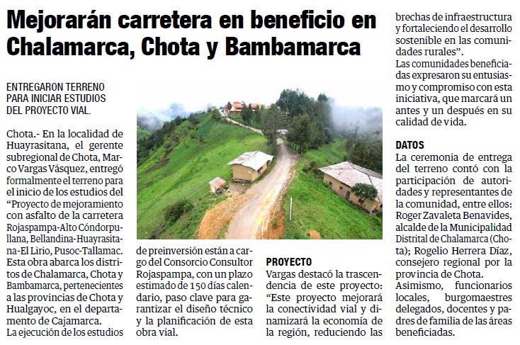 Mejorarán carretera en beneficio en Chalamarca, Chota y BambamarcaBy Monitoreo Medios / enero 10, 2025 FUENTE: Panorama Cajamarquino – Pág. 12