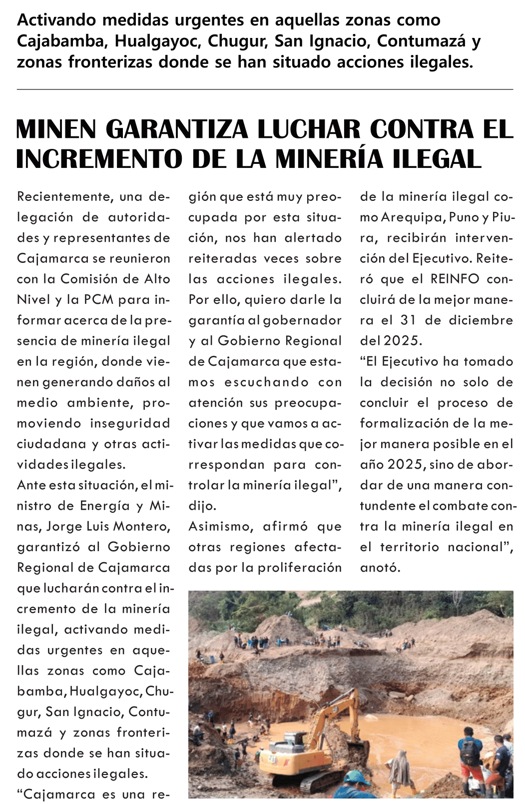 MINEM garantiza luchar contra el incremento de la minería ilegalBy Monitoreo Medios / junio 26, 2025 Fuente: El Clarín - Pág. 5Fecha: 26 junio, 2025