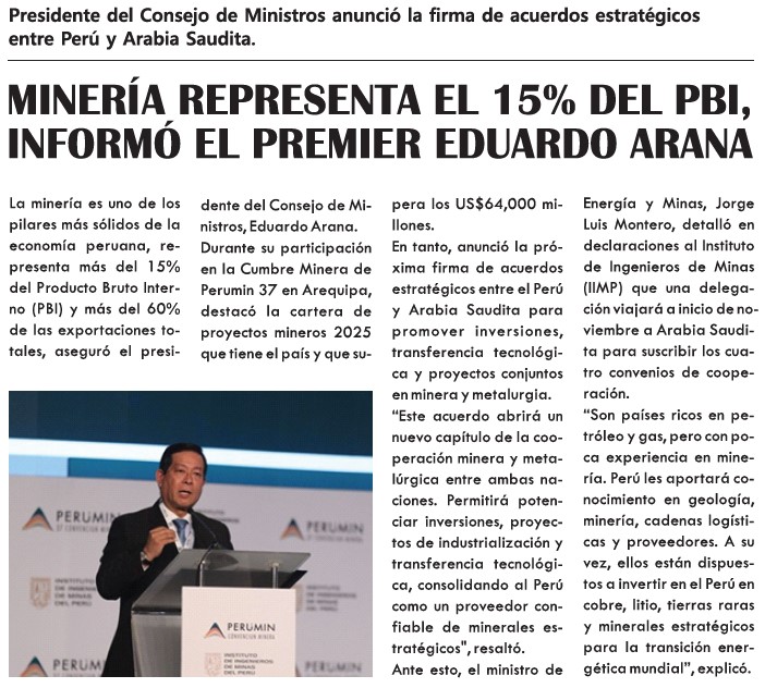 Minería representa el 15% del PBI, informó el premier Eduardo AranaBy Monitoreo Medios / septiembre 24, 2025 Fuente: El Clarín - Pág. 8Fecha: 24 septiembre, 2025