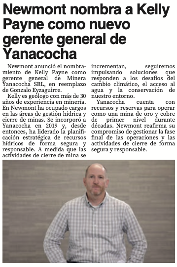 Newmont nombra a Kelly Payne como nuevo gerente general de YanacochaBy Monitoreo Medios / junio 18, 2025 Fuente: El Nuevo Diario - Pág. 6Fecha: 18 junio, 2025