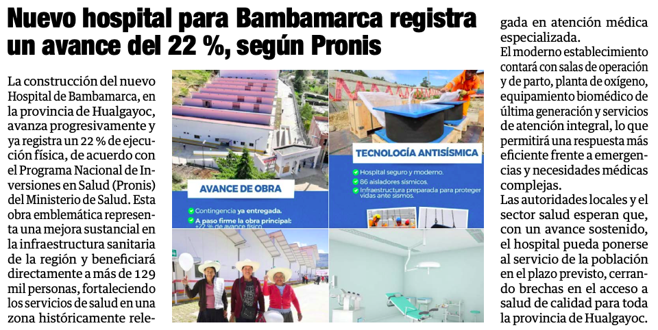 Nuevo hospital para Bambamarca registra un avance del 22%, según PronisBy Monitoreo Medios / julio 31, 2025 Fuente: Panorama Cajamarquino - Pág. 4Fecha: 31 julio, 2025
