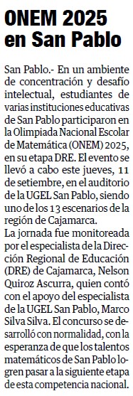 ONEM 2025 en San PabloBy Monitoreo Medios / septiembre 12, 2025 Fuente: Panorama Cajamarquino - Pág. 7Fecha: 12 septiembre, 2025