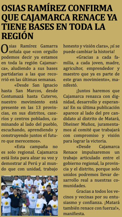 Osias Ramírez confirma que Cajamarca Renace ya tiene bases en toda la regiónBy Monitoreo Medios / junio 11, 2025 Fuente: Alma Noticias - Pág. 4Fecha: 11 junio, 2025
