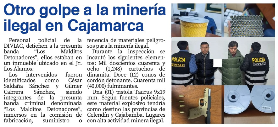 Otro golpe a la minería ilegal en CajamarcaBy Monitoreo Medios / septiembre 10, 2025 Fuente: El Nuevo Diario - Pág. 3Fecha: 10 septiembre, 2025